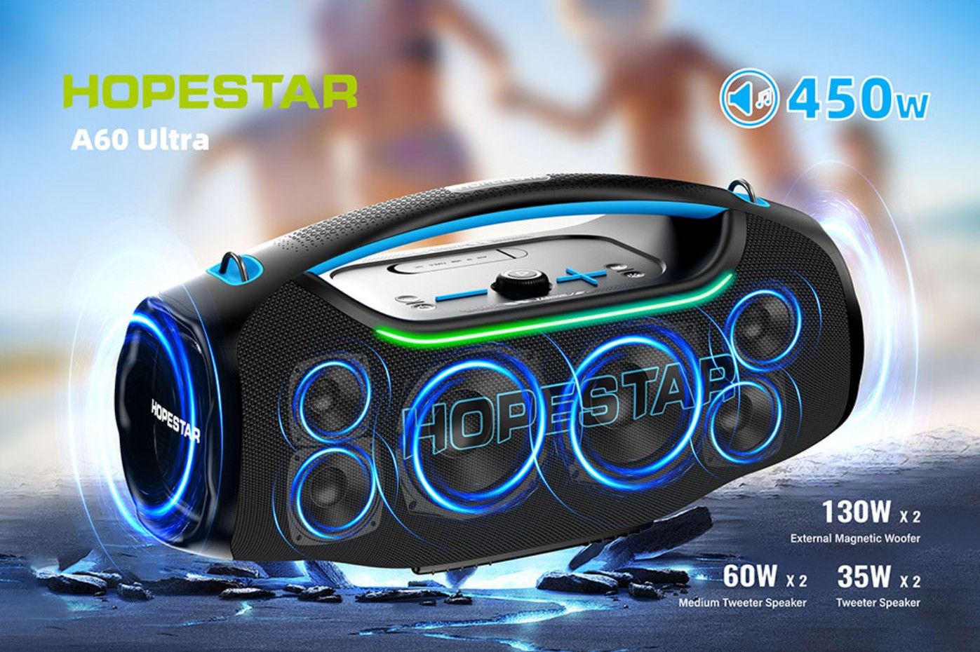 HOPESTAR A60ultra — это инновационное решение в области качества звука, основанное на новейших технологиях. Устройство оснащено 24-битным аудиоэффектом, имеет мощность 450 Вт, технологию улучшения звуковых эффектов, Bluetooth 5.4 и поддерживает беспроводное подключение нескольких устройств через AURACAST. Кроме того, оно оснащено мощным усилителем низких частот с динамической RGB-подсветкой и съемным аккумулятором.