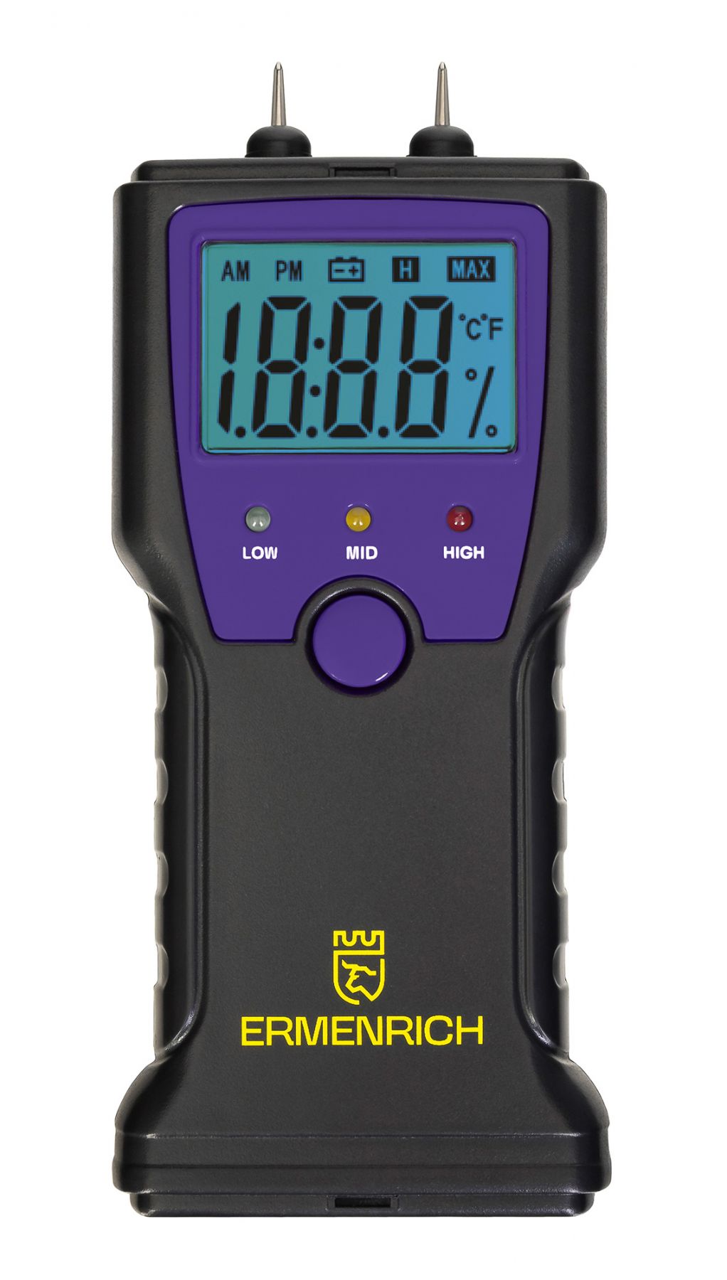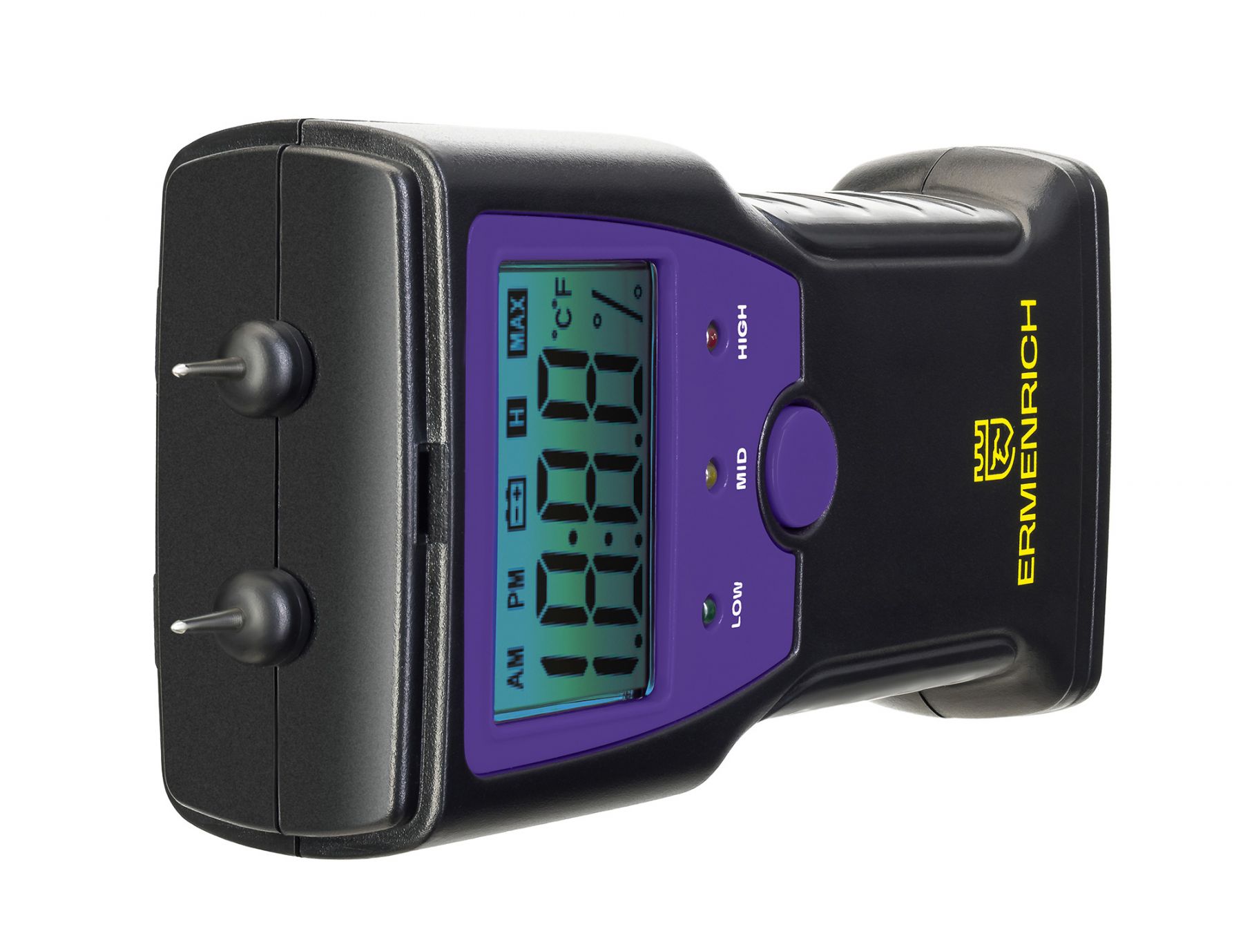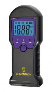Датчик влажности (влагомер) Ermenrich Wett MW10 – портативный измерительный инструмент, который определяет уровень влажности разных материалов: в первую очередь сделанных из древесины, но также и предназначенных для строительных работ (растворов, смесей и проч.). Он работает по контактной технологии, т. е. имеет пару игольчатых сенсоров, которые и проводят замеры. Также прибор может определять температуру.