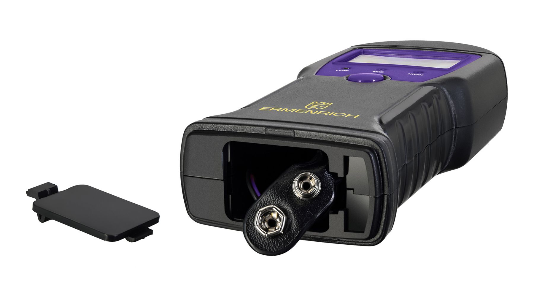 Прибор работает от батарейки 9 В, есть функция автоотключения через 1 минуту бездействия. При низком заряде батарейки на экране появляется соответствующее уведомление.