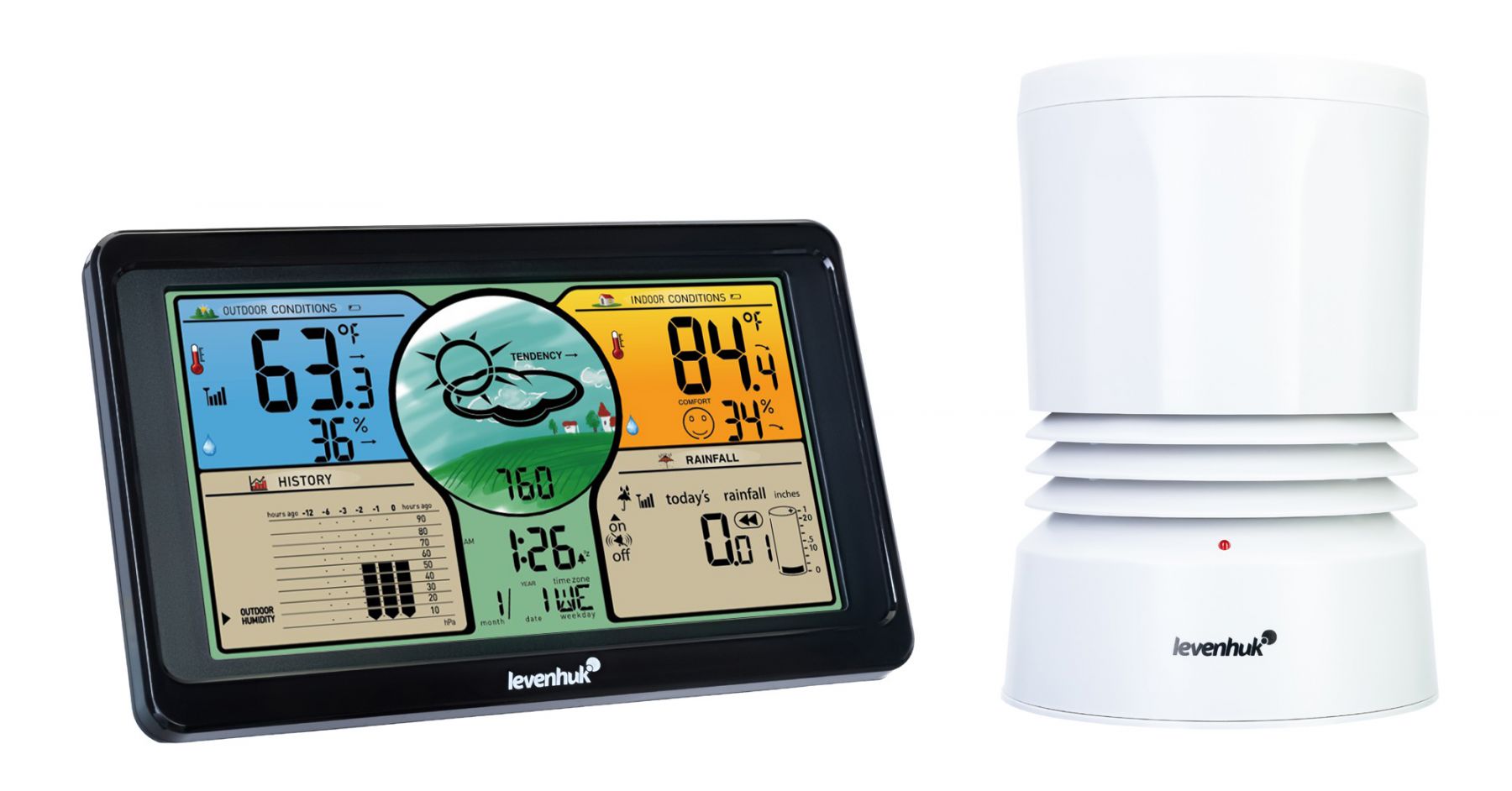 Levenhuk Wezzer PLUS LP70 – многофункциональная метеостанция, которая предоставляет исчерпывающую информацию о погоде и микроклимате в помещении. Основной блок станции проводит внутренние измерения, регистрируя температуру и влажность дома. Внешний датчик определяет уличные показатели: температуру, влажность и количество осадков. Сведения передаются на станцию по радиосвязи. Станция измеряет давление, прогнозирует погоду на ближайшее время, отображает тенденции к изменениям параметров и уровень общего комфорта.
