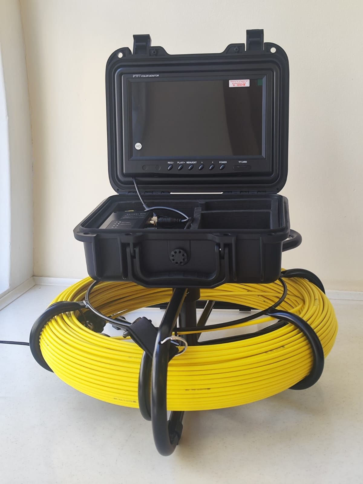Промышленный эндоскоп для обследования труб AVT 9600-9-23-100MR имеет чёткий 9" цветной дисплей, устройство записи фото и видео. Устройство отличается удобной конструкцией для переноски и сматывания-разматывания кабеля. На кабеле нанесены метровые отметки.