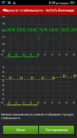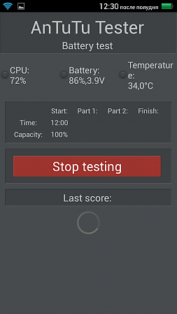 Так же мы решили протестировать АКБ, тест проведен при помощи программы AnTuTu Tester. Эта тест загружает процессор, включает беспроводные модули и все время тестирования не гасит экран (который кстати ставится на максимальную яркость).