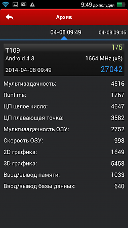 Второй тест мы провели с использованием программы Quadrant Standart Edition. Список смартфонов в данном тестере не обновлен до последних новинок, но там так же представлены устройства не уступающие Twinovo T109 в цене, зато как видно уступающие в производительности! Наш флагман занял лидирующее первое место набрав почти 8000!
