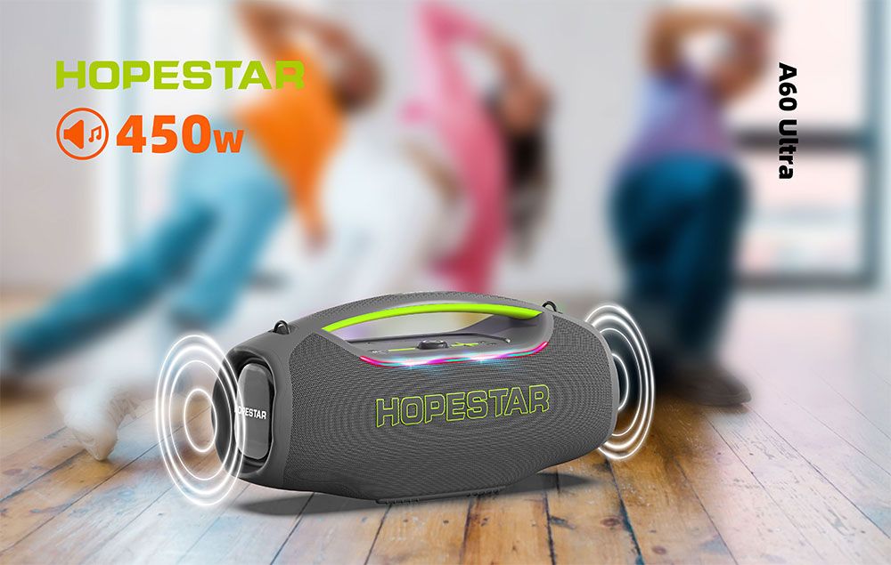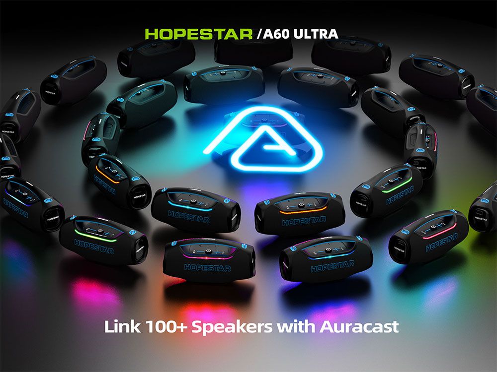 HOPESTAR A60ultra — это инновационное решение в области качества звука, основанное на новейших технологиях. Устройство оснащено 24-битным аудиоэффектом, имеет мощность 450 Вт, технологию улучшения звуковых эффектов, Bluetooth 5.4 и поддерживает беспроводное подключение нескольких устройств через AURACAST. Кроме того, оно оснащено мощным усилителем низких частот с динамической RGB-подсветкой и съемным аккумулятором.