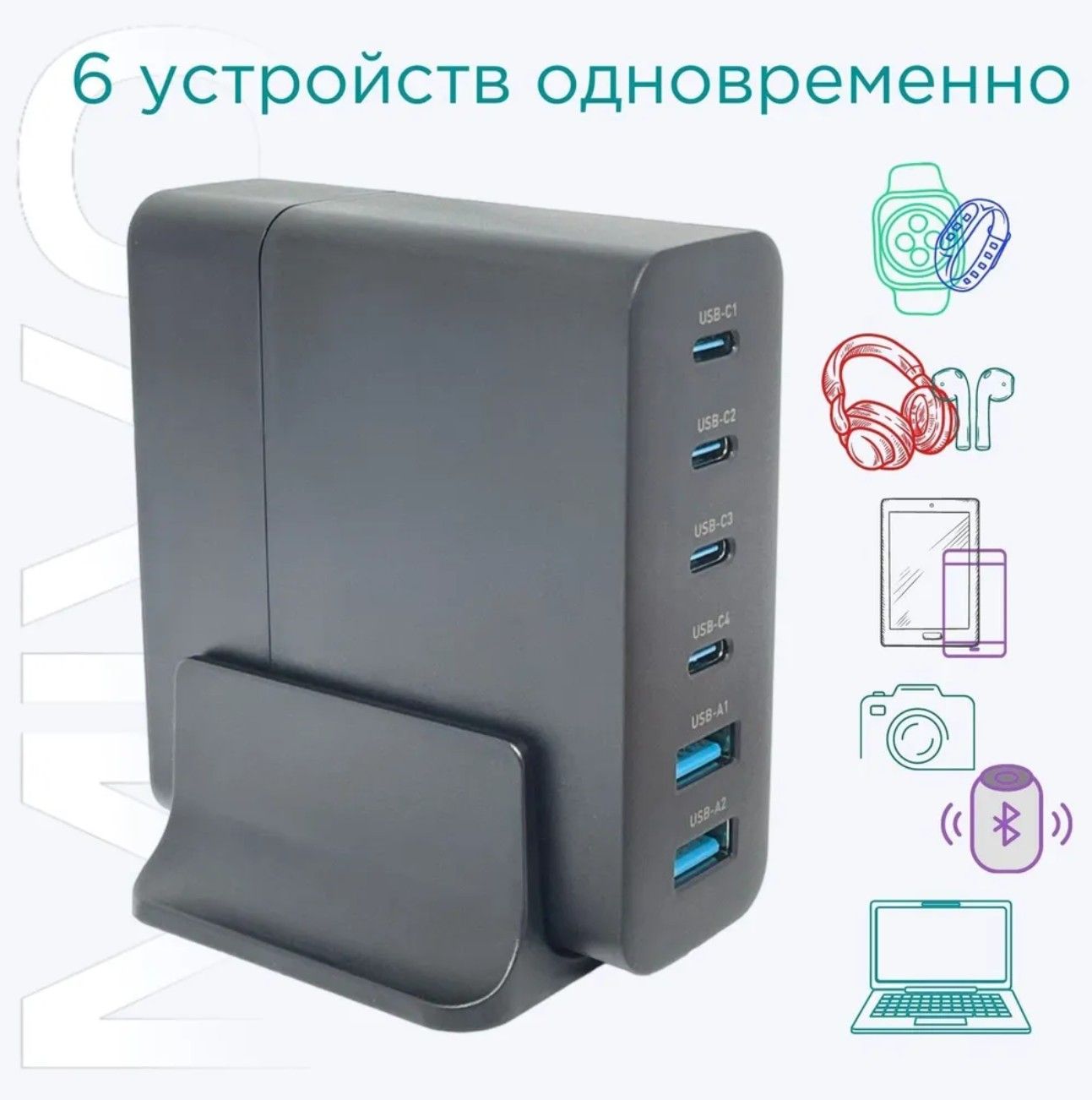 Зарядная станция Mivo MP-123Q снабжена четырьмя разъемами USB Type-C и двумя разъемами USB-A, это позволяет одновременно заряжать до 6 гаджетов. Все разъемы поддерживают технологию быстрой зарядки: Power Delivery и Quick Charge 4.0. Суммарная мощность устройства 123Вт. Адаптер подходит для подключения бытовых приборов и зарядки любого современного электронного устройства поддерживающего зарядку через USB или Type-C кабель. Заряжайте ваши планшеты, смартфоны, беспроводные наушники, повербанки, часы, фитнес браслеты, колонки, фотоаппараты и прочие гаджеты. Настольная зарядка снабжена системами защиты от перегрузки по току, перегрева и короткого замыкания. Длинна провода 1.5 метра, корпус зарядного устройства сделан из качественного, огнеупорного ABS пластика, не имеет постороннего запаха и презентабельно выглядит.