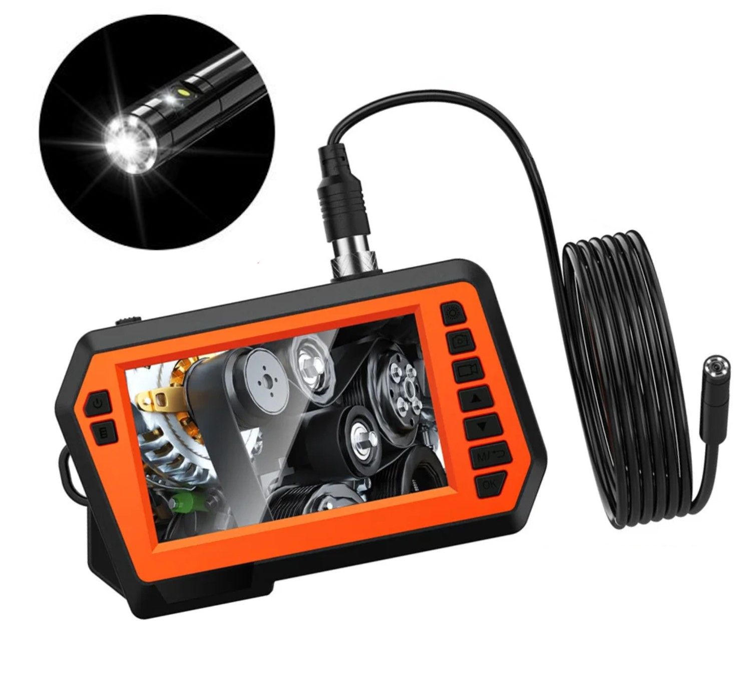 Модернизированная инспекционная камера FHD 1080P с двумя объективами (угол обзора 70°), которая помогает вам наблюдать с фронтальной и боковой камер, а не через зеркало. Эргономичный дизайн, легкое управление всеми кнопками одной рукой. Оснащен функцией разделения экрана, есть несколько режимов наблюдения на выбор и переключение с помощью одной кнопки. Цветной экран с диагональю 4,3 дюйма четко отображает все изображения и видео в реальном времени. Полужесткий кабель 2M можно согнуть, чтобы попасть в узкие места, 6 светодиодных индикаторов и водонепроницаемость IP67 позволяют зонду эндоскопа быстро и эффективно обнаруживать даже темные и подводные места.