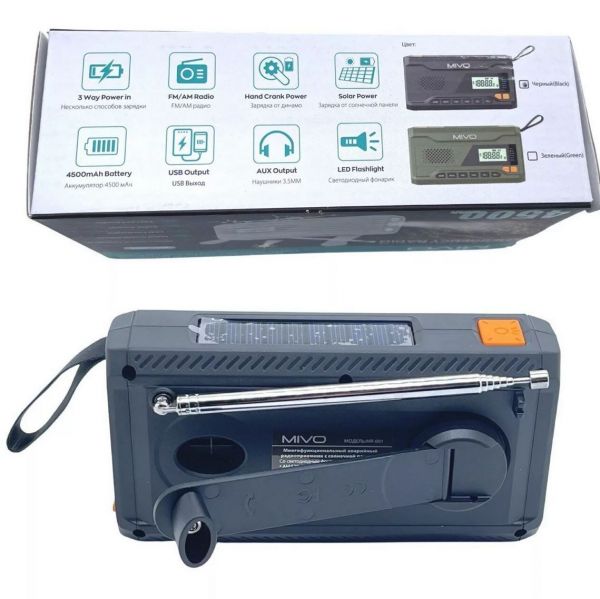 Радиоприемник Mivo MR-001 с динамо-машиной , солнечной панелью и ёмким аккумулятором 4500 мАч имеет компактные размеры и не займёт много места в походных условиях. Простое включение и выключение. Приемник ловит радиоволны в FM и AM диапазонах. Настройка радиоприемника очень простая и интуитивно понятная. Есть встроенный тройной светодиодный фонарик, имеющий три режима яркости. Встроенный перезаряжаемый литий-ионный аккумулятор на 4500 мАч дает возможность длительной работы без подзарядки, а с учетом наличия динамо-машины - Вы всегда сможете сгенерировать энегрию для подзарядки. В Mivo MR-001 есть индикатор заряда батареи.