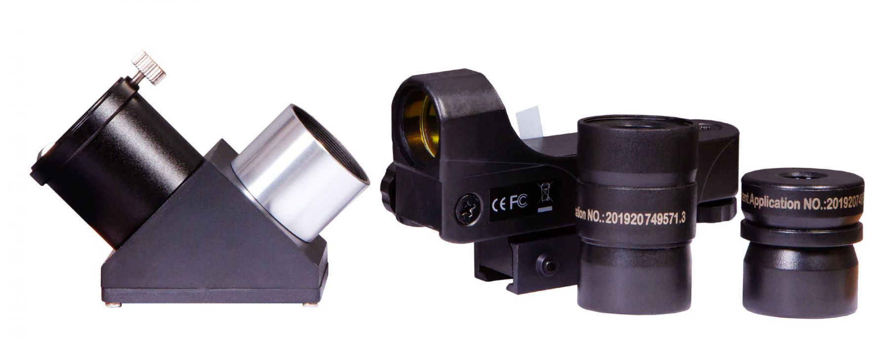 Телескоп собран по зеркально-линзовой схеме. А это значит, что в нем сочетаются компактная конструкция и отличные оптические возможности. Этот телескоп можно поставить на лоджию, с ним удобно путешествовать. Из оптических аксессуаров в комплект поставки включены два разнофокусных окуляра и диагональное зеркало. Последнее используется для наземных наблюдений. Для наведения на астрономические объекты применяется искатель с красной точкой.