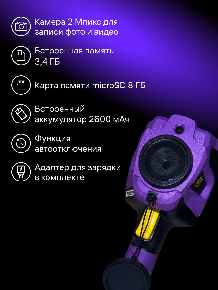 Питание обеспечивает литий-ионный аккумулятор емкостью 2600 мАч, заряда которого хватает на период до 4 часов непрерывной работы – этого достаточно для полного обследования здания или промышленного объекта. Тепловизор рассчитан на использование в сложных условиях: диапазон рабочих температур от –15 до +50 °C позволяет применять его как в помещении, так и на улице, в том числе в зимний период.