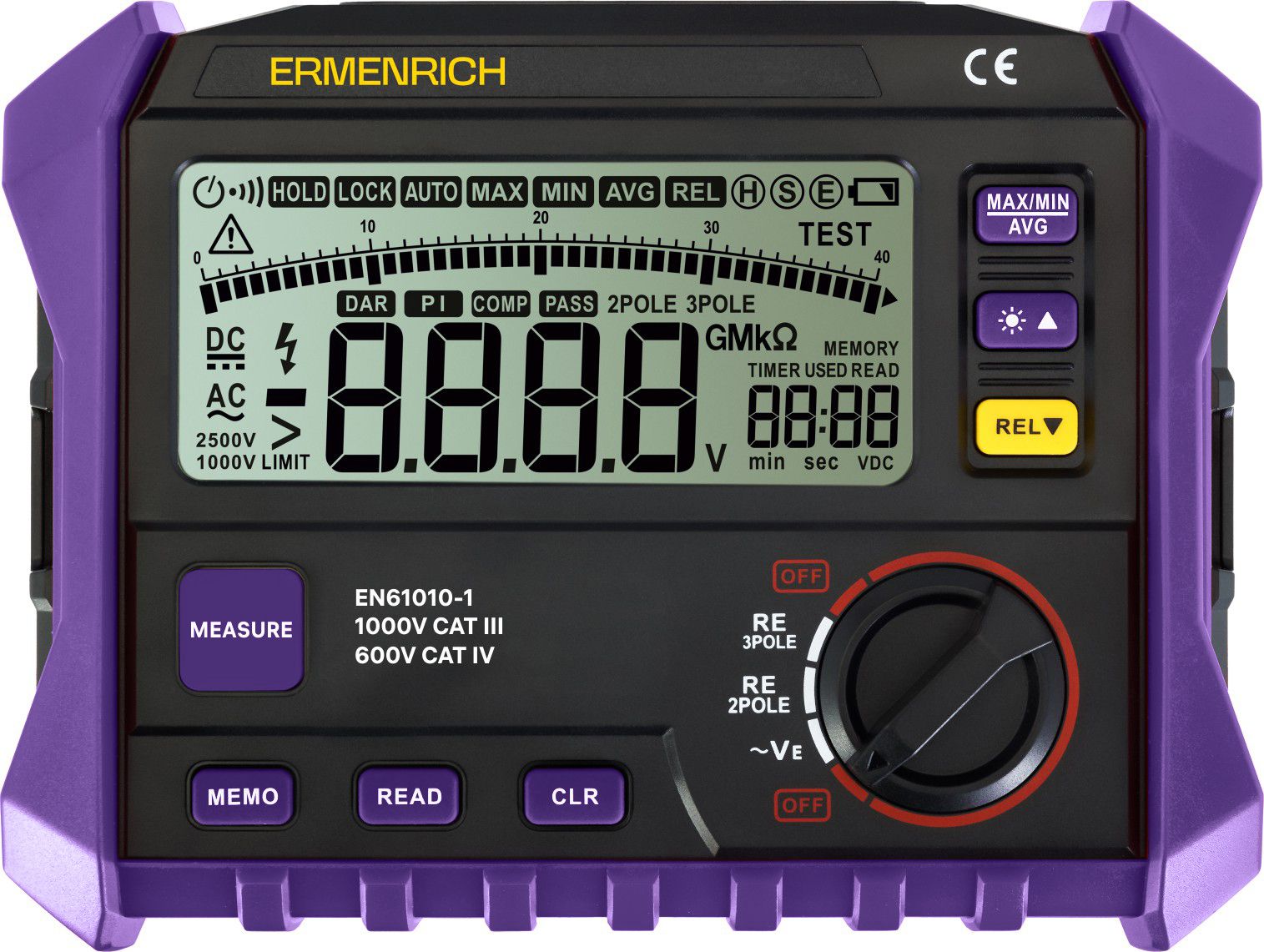 Тестер заземления Ermenrich Ping ET60 – прибор для измерения сопротивления заземления в интервале 0–4 кОм. Оснащен ЖК-дисплеем с двумя форматами отображения, числовым и аналоговым (графическая шкала). Имеет удобный поворотный переключатель для выбора диапазона измерения. Если результат замера не получается посмотреть сразу (например, если экран повернут от пользователя), его можно «заморозить» на дисплее и посмотреть позднее (функция Hold). В памяти устройства можно сохранять минимальные, средние и максимальные результаты измерений. Есть функция относительных измерений по опорным значениям (кнопка REL).