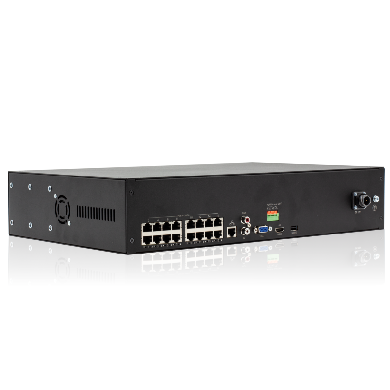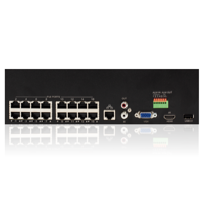 Подключение камер производится витой парой с разъёмами RJ-45 через встроенные порты 10/10/1000 Base-T Ethernet с поддержкой PoE. Регистратор позволяет осуществлять единовременно запись, хранение и воспроизведение архива.