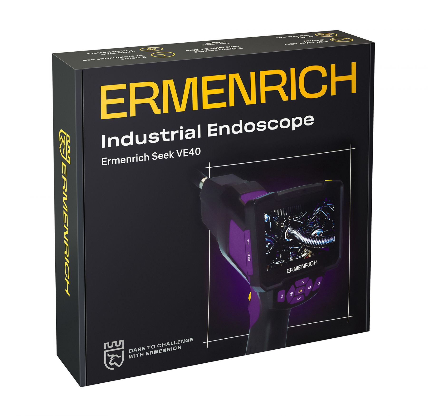 Технический эндоскоп Ermenrich Seek VE40 предназначен для осмотра трудноступных мест при ремонте трубопроводов и систем вентиляции, обслуживании промышленного оборудования и автомобилей, строительстве зданий. Эндоскоп оснащен цветным ЖК-дисплеем с диагональю 4,3". На полужестком кабеле расположена камера для фотосъемки в качестве 1280x720 пикс и записи видео в качестве 640x480 пикс.
